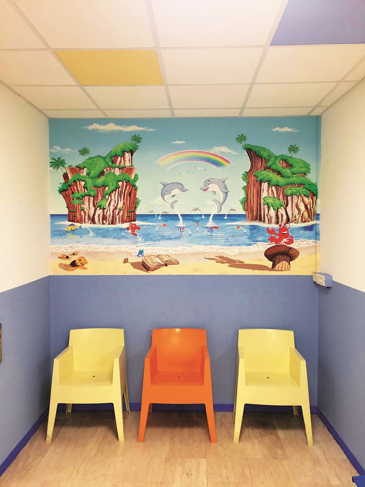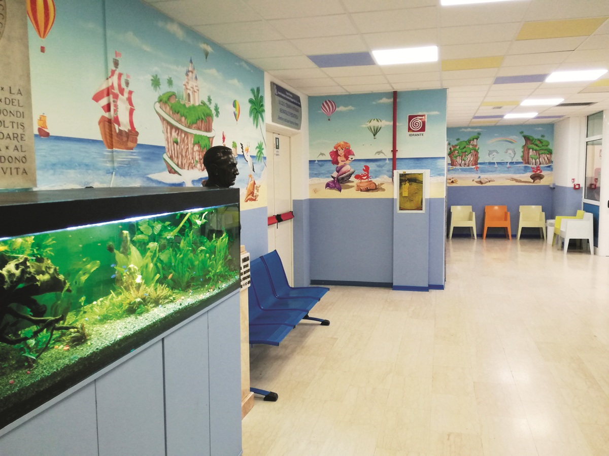 Abbiamo decorato completamente l’atrio e rinnovato l’acquario posto prima dell’accesso alla sala d’attesa del pronto soccorso pediatrico, completando così un percorso visivo e simbolico fatto di colore, fantasia e attenzione.
